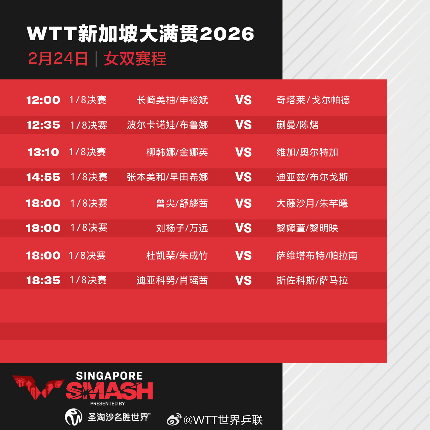 24日,2026年WTT新加坡大满贯插足正赛第三天,林诗栋、王楚钦、王曼昱、蒯曼等出场。具体赛程如下: