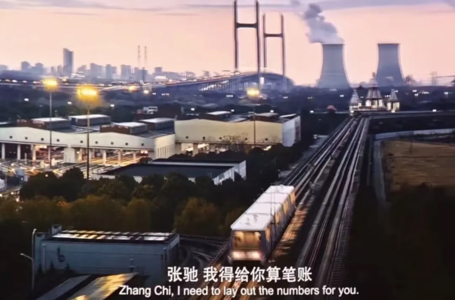 张弛在电影起首算账的场景,布景是纷乱的烟囱,晚霞下的工业风硬核又随和。