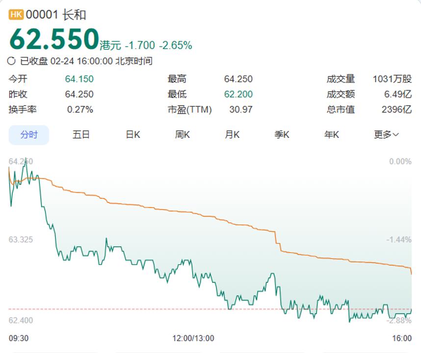 2月24日,长和股价跳水,法子休市下降2.65%,总市值2396亿港元。