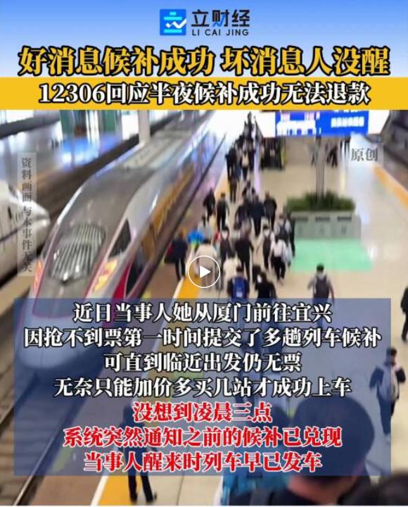 该网友暗示,其在购买厦门至宜兴返程票时,M6体育凤凰彩票welcome凌晨3点才收到候补得手见告,因熟寝未实时检察,醒来时列车已发车,近1700元车票无法全额退款。