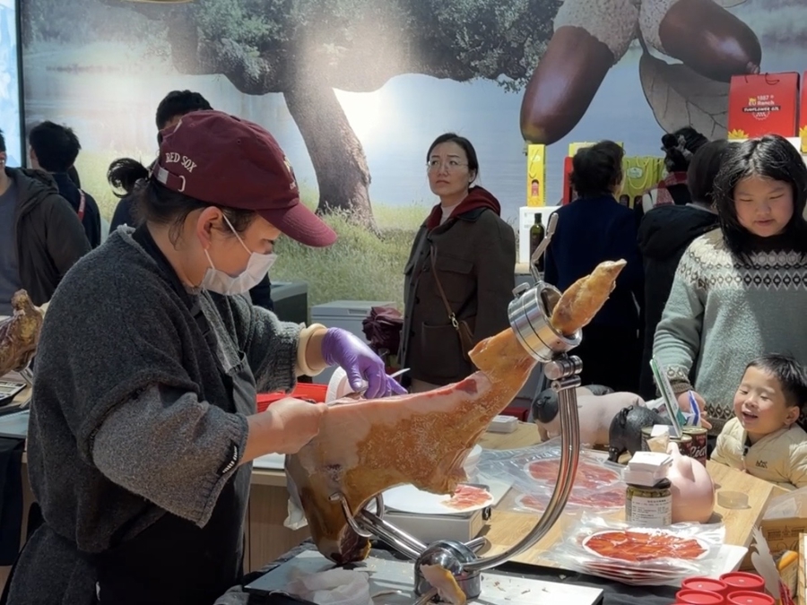 西班牙火腿馆的伴计正在切火腿。吴恺沄摄